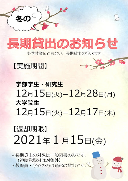 2020/12/11 【学生の皆さんへ】12/15(火)から冬季休業に伴い長期貸出をします。返却期限日は1/15(金)です。 芸術文化図書館 【学生の皆さんへ】12/15(火)から冬季休業に伴い長期貸出をします。返却期限日は1/15(金)です。