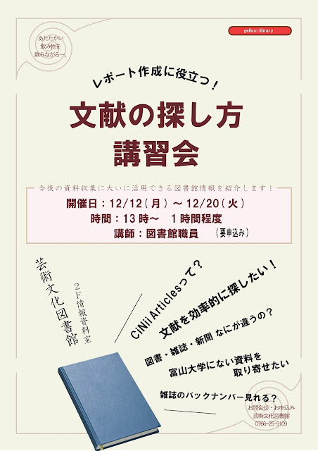文献の探し方講習会を開催します(飲み物付き) 芸術文化図書館 講習会 皆さんは、富山大学でどんな資料やデータベースを利用できるのか知っていますか? 新聞記事を探す時、雑誌記事を探す時、どうしますか? 図書館にほしい資料が無い時、どうしますか? 図書館で、大学で使えるたくさんのお役立ちツールをご紹介します。 日時:12月12日(月)~20日(火)※土日除く 13時から 約1時間 場所:芸術文化図書館内2F 情報資料室 飲み物を用意しますので、事前に申し込みをお願いします。 お申込み・お問い合わせは 芸術文化図書館まで