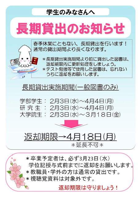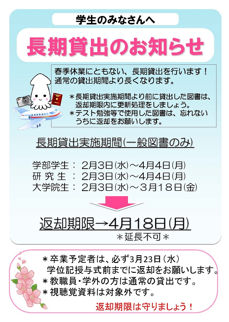 春季休業にともなう長期貸出のお知らせ 芸術文化図書館 【学生のみなさまへ】 芸術文化図書館では、春季休業にともない、長期貸出を行います。 長期貸出実施期間(一般図書のみ、視聴覚資料は除く) 学部学生 : 2015年2月3日(水) – 4月4日(月)研究生 : 2015年2月3日(水) – 4月4日(月)大学院生 : 2015年2月3日(水) – 3月18日(金) ⇓ 返却期限 :2015年4月18日(月) *延長不可*卒業予定者は、学位記授与式前に必ず返却してください。