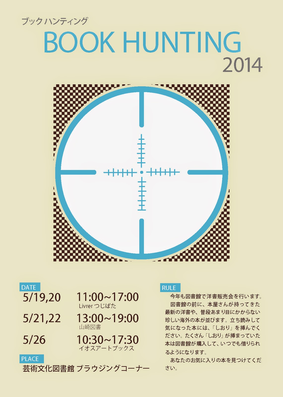 BOOK HUNTING 2014開催予告 芸術文化図書館 今や恒例となりましたブックハンティングを開催します。 今年は、3つの書店が日替わりでやって来ます。 「図書館にあったらいいな」、と思う本があったら、どんどん「しおり」を挟んでください。 しおりは、図書館入口横(自動ドアのそば)にあります。 本1冊につき、一人1枚でお願いします。 たくさんしおりが挟まっていた図書を後日図書館で購入します。 是非お見逃しなく!!