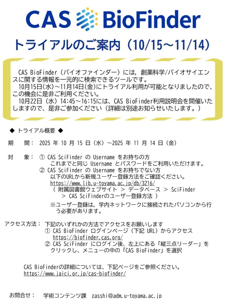 10月22日(水)14:45~16:15には、CAS BioFinder利用説明会を開催いたしますので、是非ご参加ください(説明会の詳細はこちら)。