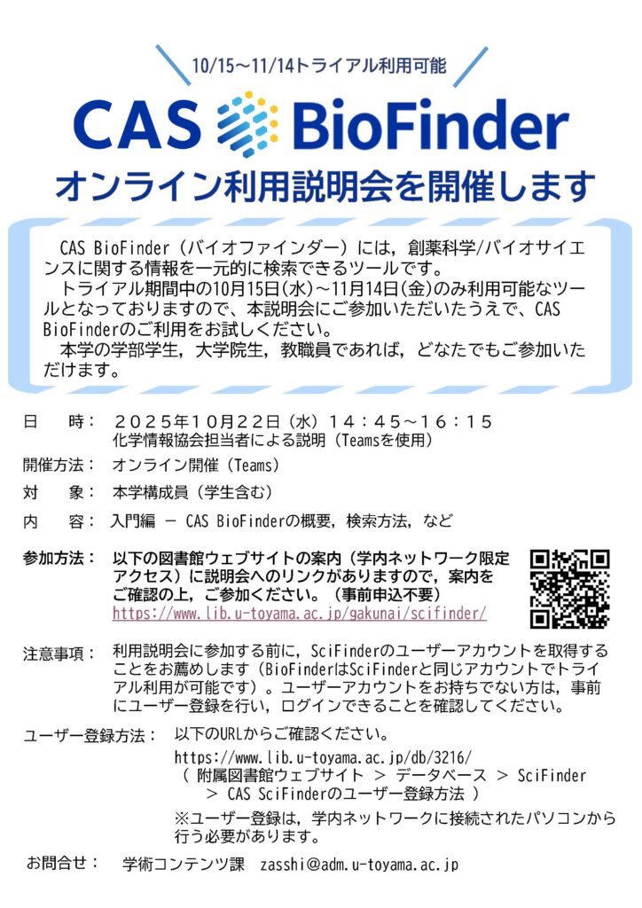 トライアル期間中の10月15日(水)~11月14日(金)のみ利用可能なツールとなっておりますので、本説明会にご参加いただいたうえで、CAS BioFinderのご利用をお試しください(トライアルの詳細はこちら)。