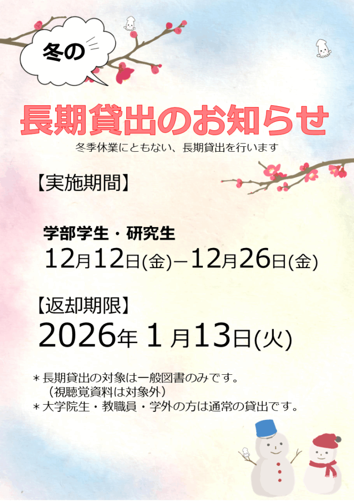 [学部学生の皆さまへ]冬の長期貸出を実施します(12/12~12/26) 中央図書館 2025年12月5日 冬季休業にともない、長期貸出を行います。 対象資料:一般図書のみ 実施期間 学部学生・研究生(学部学生):2025年12月12日(金)-2025年12月26日(金) 返却期限:2026年1月13日(火) ※延長不可 [注意事項] *大学院生・教職員・学外の方は通常の貸出です。 *視聴覚資料は対象外です。