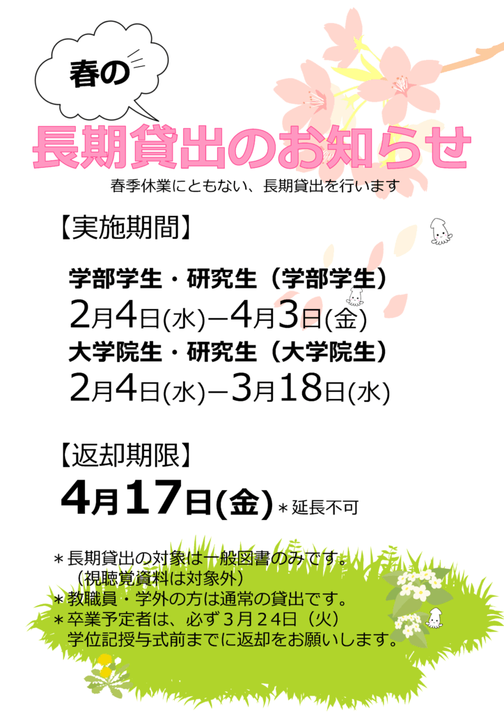 [学生の皆さまへ]春の長期貸出を実施します(2/4~4/3) 中央図書館 2025/1/28 春季休業にともない、長期貸出を行います。 対象資料:一般図書のみ 実施期間 学部学生・研究生等(学部学生):2026年2月4日(水)-4月3日(金) 大学院生・研究生等(大学院生):2026年2月4日(水)―3月18日(水) 返却期限:2026年4月17日(金) ※延長不可 [注意事項] *教職員・学外の方は通常の貸出です。 *視聴覚資料は対象外です。 *卒業予定者は、学位授与式(3月24日(火))までに返却してください。
