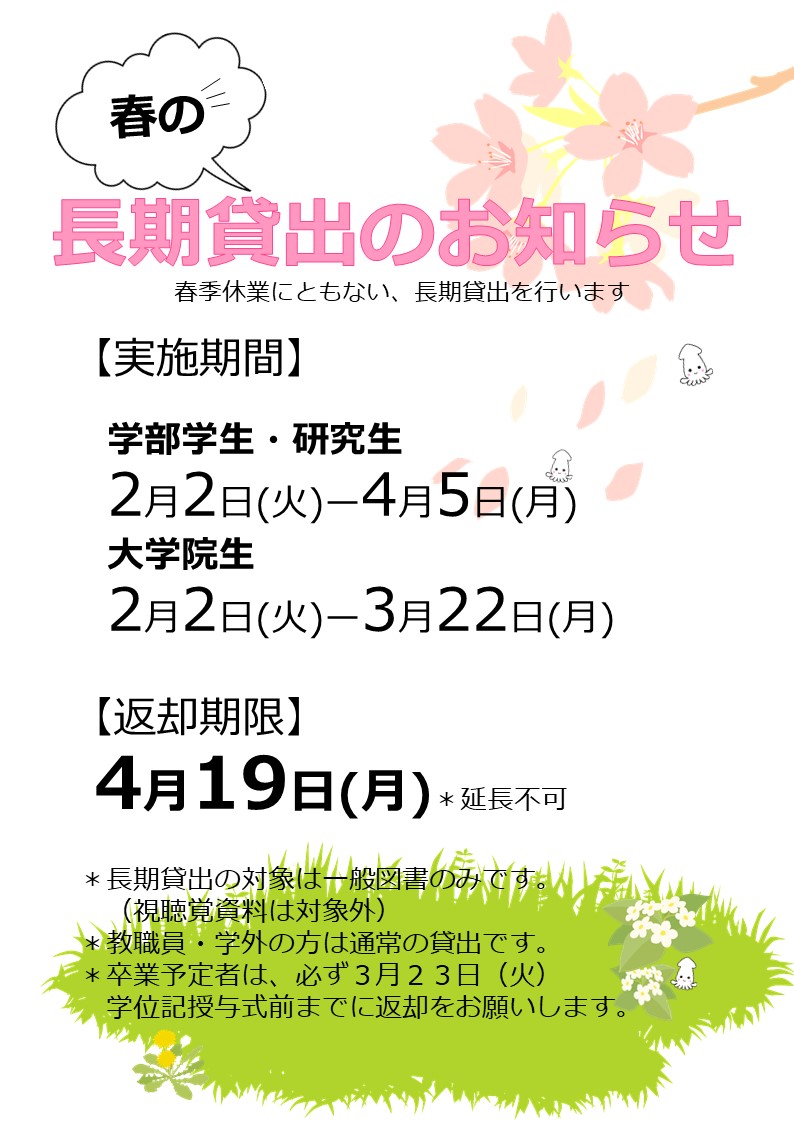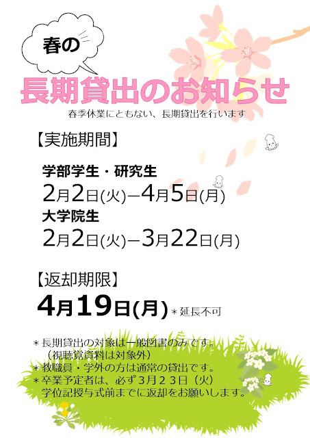 中央図書館・工学専門図書室では、春季休業にともなう長期貸出を行います。