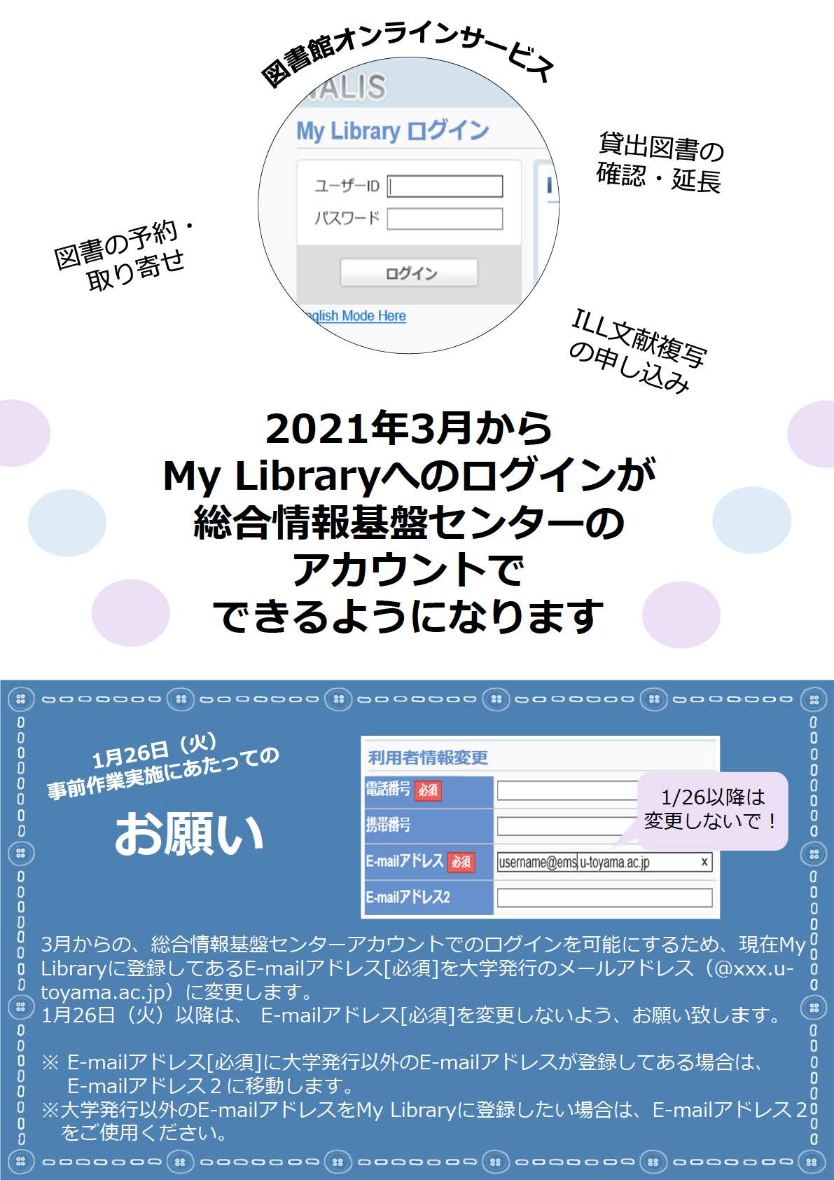 2021年1月26日(火)に現在My Libraryに登録してあるE-mailアドレス[必須]を大学発行のメールアドレス(@xxx.u-toyama.ac.jp)に変更します。My Libraryを利用する方が直接作業を行う必要はありませんが、1月26日(火)以降は、E-mailアドレス[必須]を変更しないよう、お願いします。