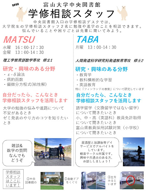 A.2020年度後期の学修相談スタッフは2名おり、それぞれの専攻と対応時間は次のとおりです。予約不要で相談できます(突然訪ねてOKです)。このページ下の自己紹介を兼ねたポスターもご確認ください。