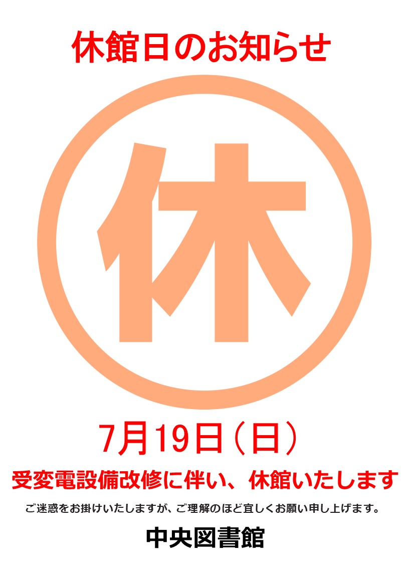 2020年7月19日(日)は受変電設備改修に伴い、休館いたします。