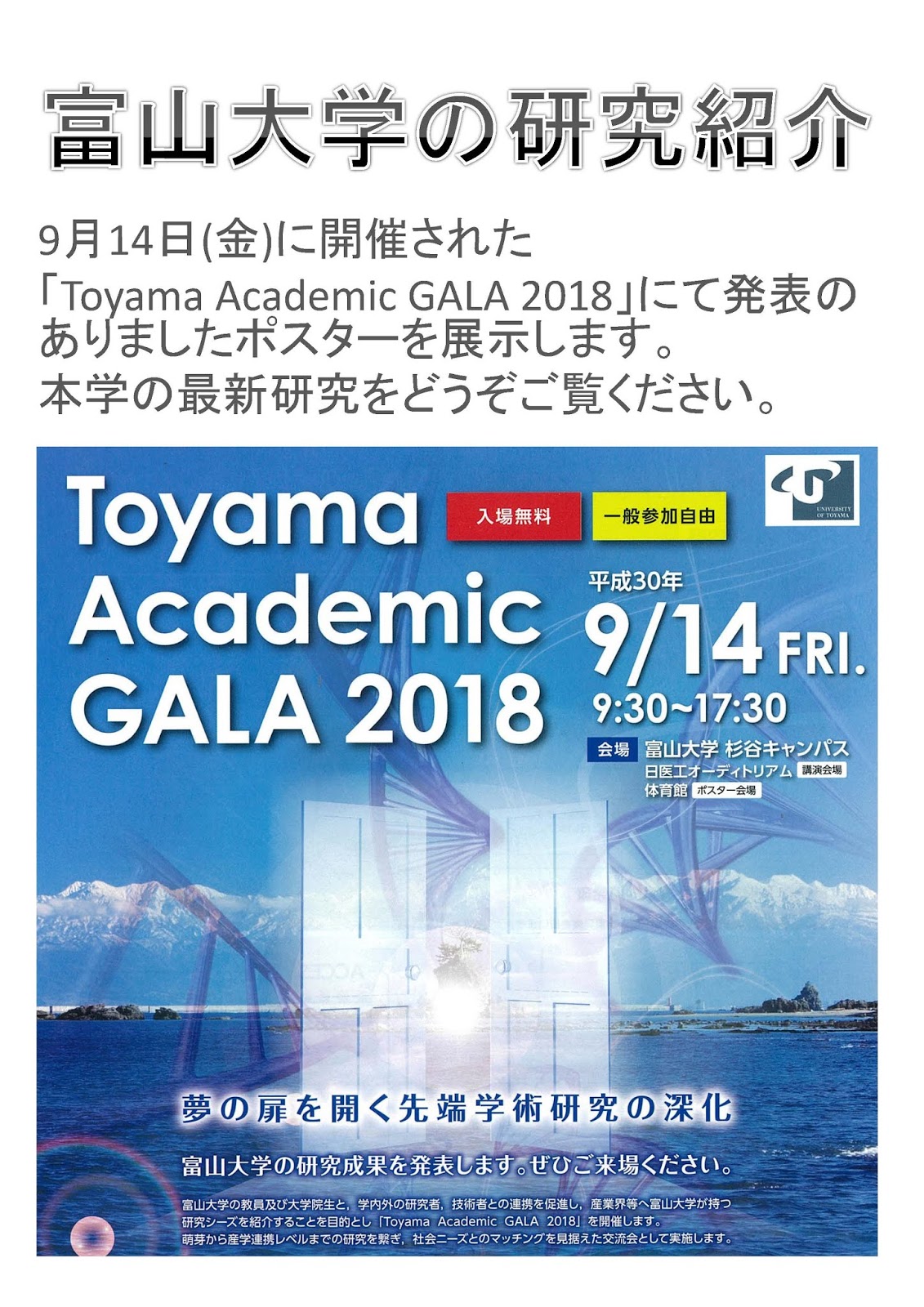 ポスター展示「Toyama Academic GALA 2018」 第2弾 開催中です 中央図書館 https://www.u-toyama.ac.jp/outline/event/index.html#event_180914 展示場所 : 中央図書館 2階ロビー 11/20 ポスターを入れ替えました!