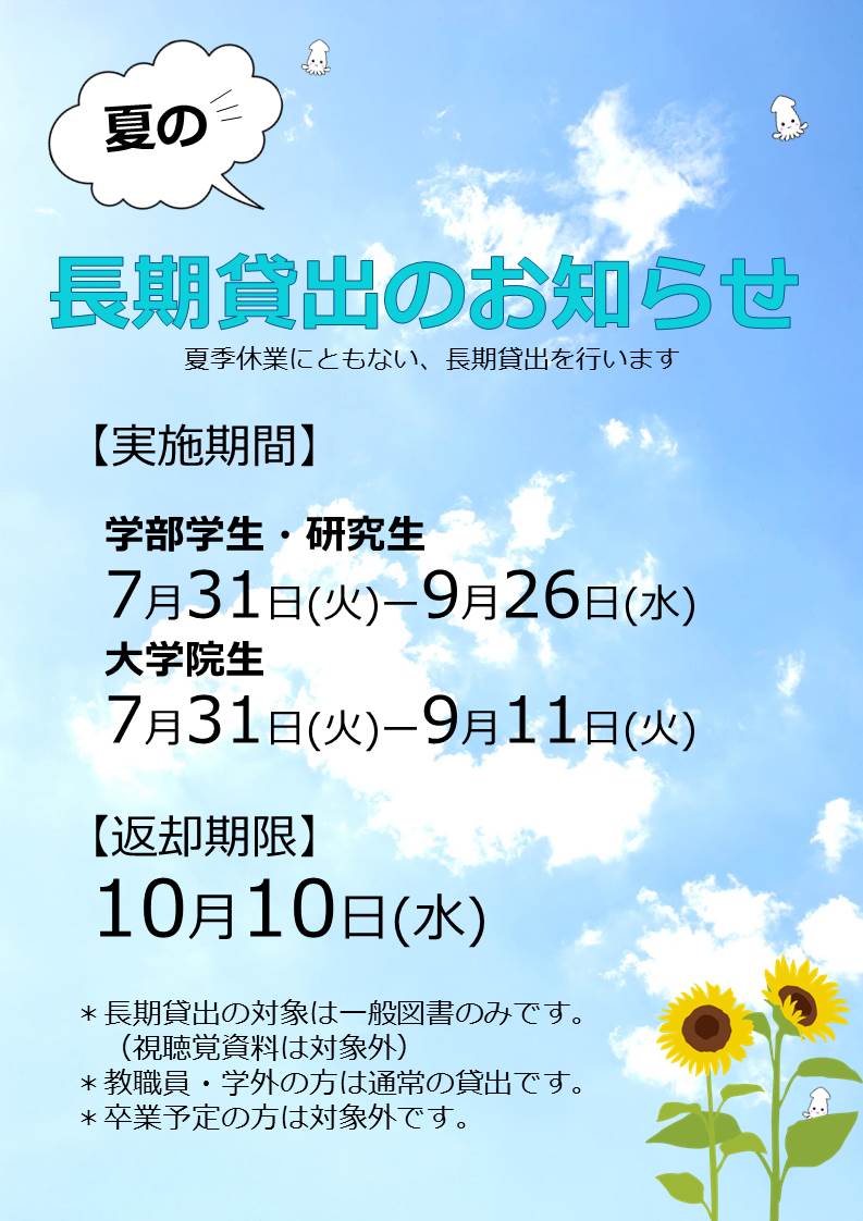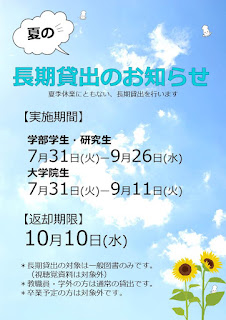 学生のみなさんへ:夏季休業にともなう長期貸出のお知らせ 中央図書館 中央図書館・工学専門図書室では、夏季休業にともなう長期貸出を行います。 学生・研究生・院生のみなさんは、通常の貸出期間より長くなります。 長期貸出実施期間(一般図書のみ) 学部学生・研究生 2018年7月31日(火) – 9月26日(水)大学院生 2018年7月31日(火) – 9月11日(火) 返却期限 2018年10月10日(水) *延長不可* *教職員・学外の方は通常の貸出です。 *視聴覚資料は対象外です。