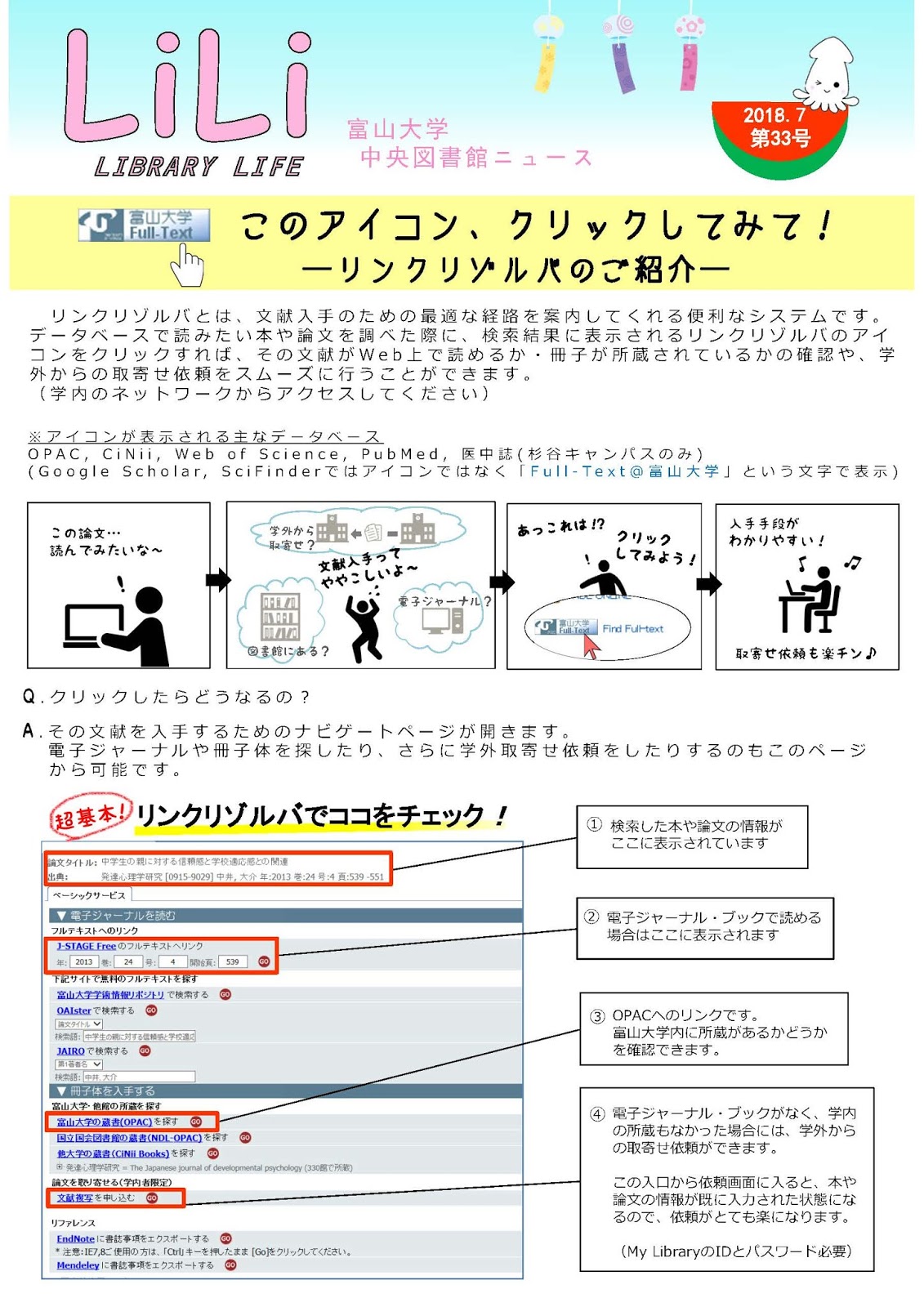 中央図書館から学生のみなさんに向けてタイムリーな情報をお届けする、中央図書館ニュース『LiLi : Library Life』の33号を発行しました。