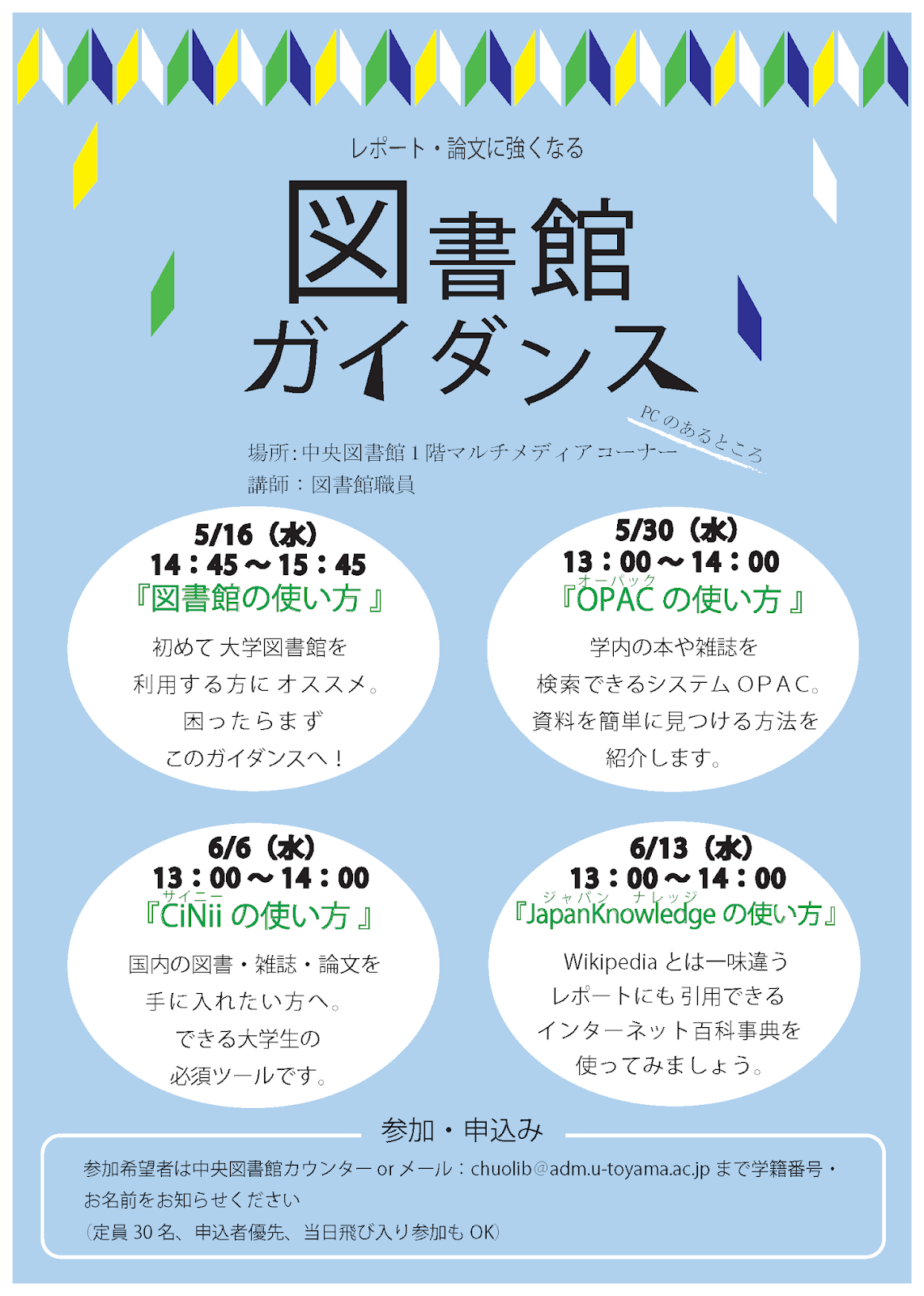 2018年5月16日~6/13日の間、図書館を使いこなすためのガイダンスを4回開催します。