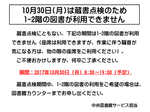 (終了)2017/10/30:蔵書点検のため1-2階の図書が利用できません 中央図書館 蔵書点検作業は終了しました。1-2階の図書もご利用いただけます。 ご協力ありがとうございました。 —————————————————————————————