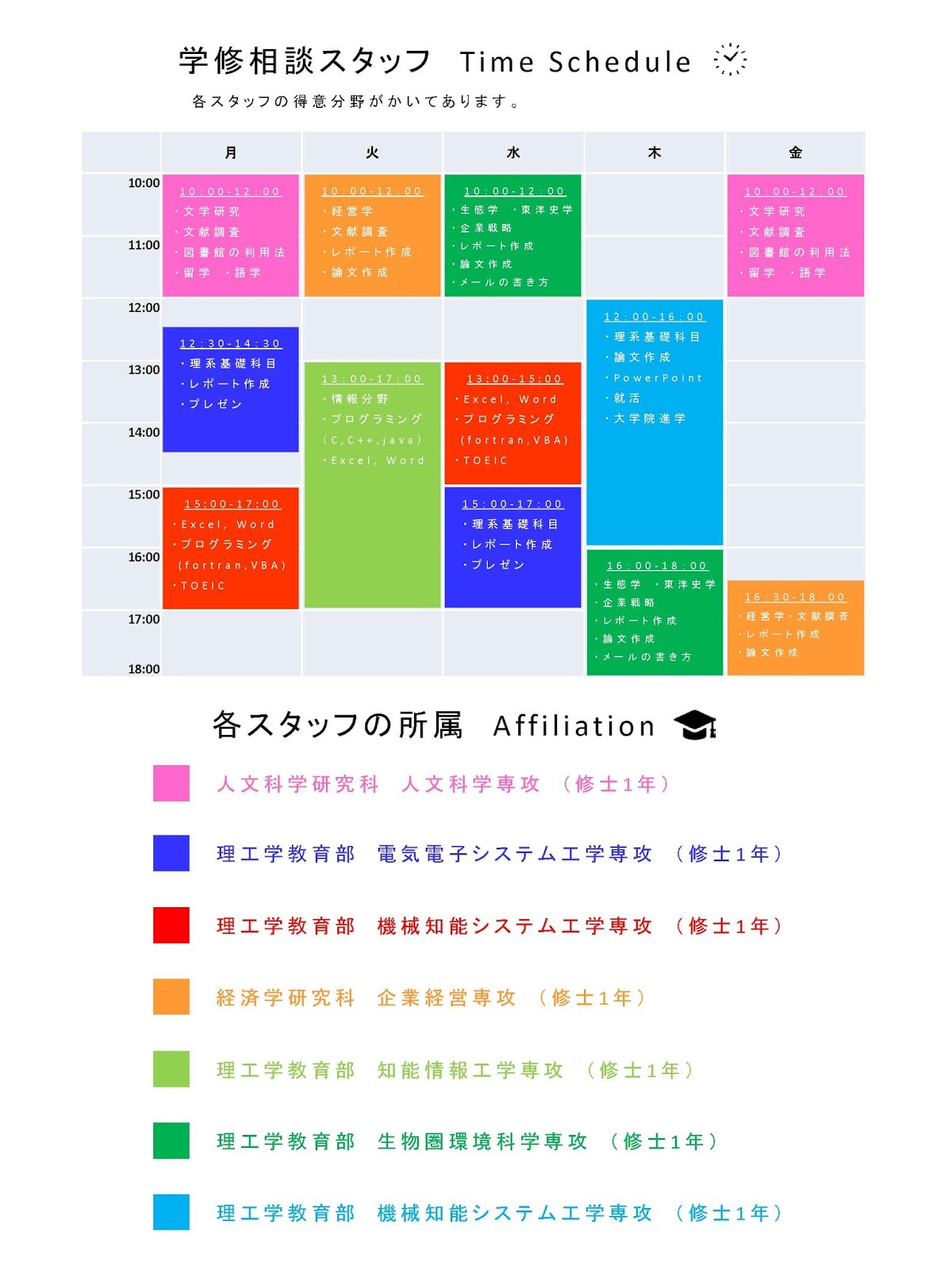 【ご案内】大学院生スタッフによる学修相談を開始しました 中央図書館 中央図書館2階ロビーにおいて, 大学院生スタッフによる学修相談を開始しました。 ・授業で習ったけど,よくわからなかった・レポートや論文の書き方がわからない・プレゼンのコツを知りたい・資料や文献の集め方を知りたい・進学しようか悩んでいる などなど,困っていることはありませんか?大学院生が身近な先輩として相談にのります。お気軽にお越しください! 期間:2016年12月1日(木)~2017年2月9日(木)