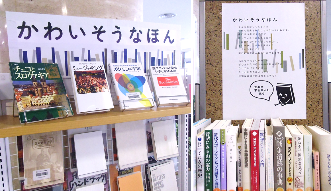 企画展示「かわいそうなほん」開催中です! 中央図書館 みなさん充実した春休みをお過ごしですか? 中央図書館1階企画展示コーナーにて,「かわいそうなほん」を開催しています。ここに展示してある本は,貸出回数が0回,つまり一度も借りられたことのないかわいそうな本たちです。 実際に読んでみると面白いのに何で・・・という本がたくさんあります。気になるものがあれば,ぜひ最初の読者になってあげてください。 この春休みにぜひご利用ください!