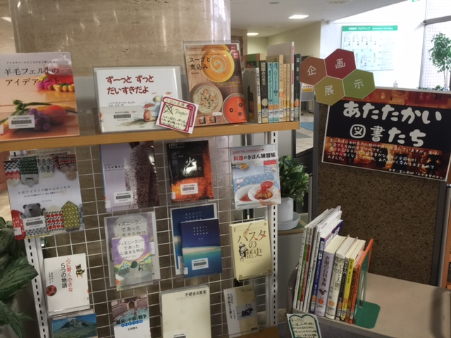 螺旋階段横の企画展示コーナーにて「あたたかい図書たち」を展示しています。