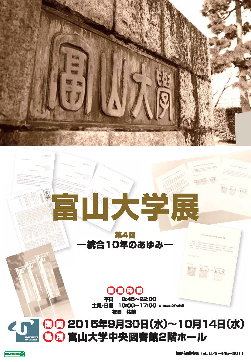【終了】「富山大学展 ~統合10年のあゆみ~」開催中(9/30(水)~10/14(水)中央図書館2階ホール) 中央図書館 平成17年10月に、旧富山大学、富山医科薬科大学、高岡短期大学が地域と世界に向かって開かれた大学として発展していくことを目指して再編統合し、新たな国立大学法人として出発してから、本年をもって10周年を迎えます。 第4回となる今回の富山大学展では、再編統合後10年間の本学のあゆみについて、年表、写真、資料等を展示し、ご紹介いたします。 多数のご来場お待ちしています。