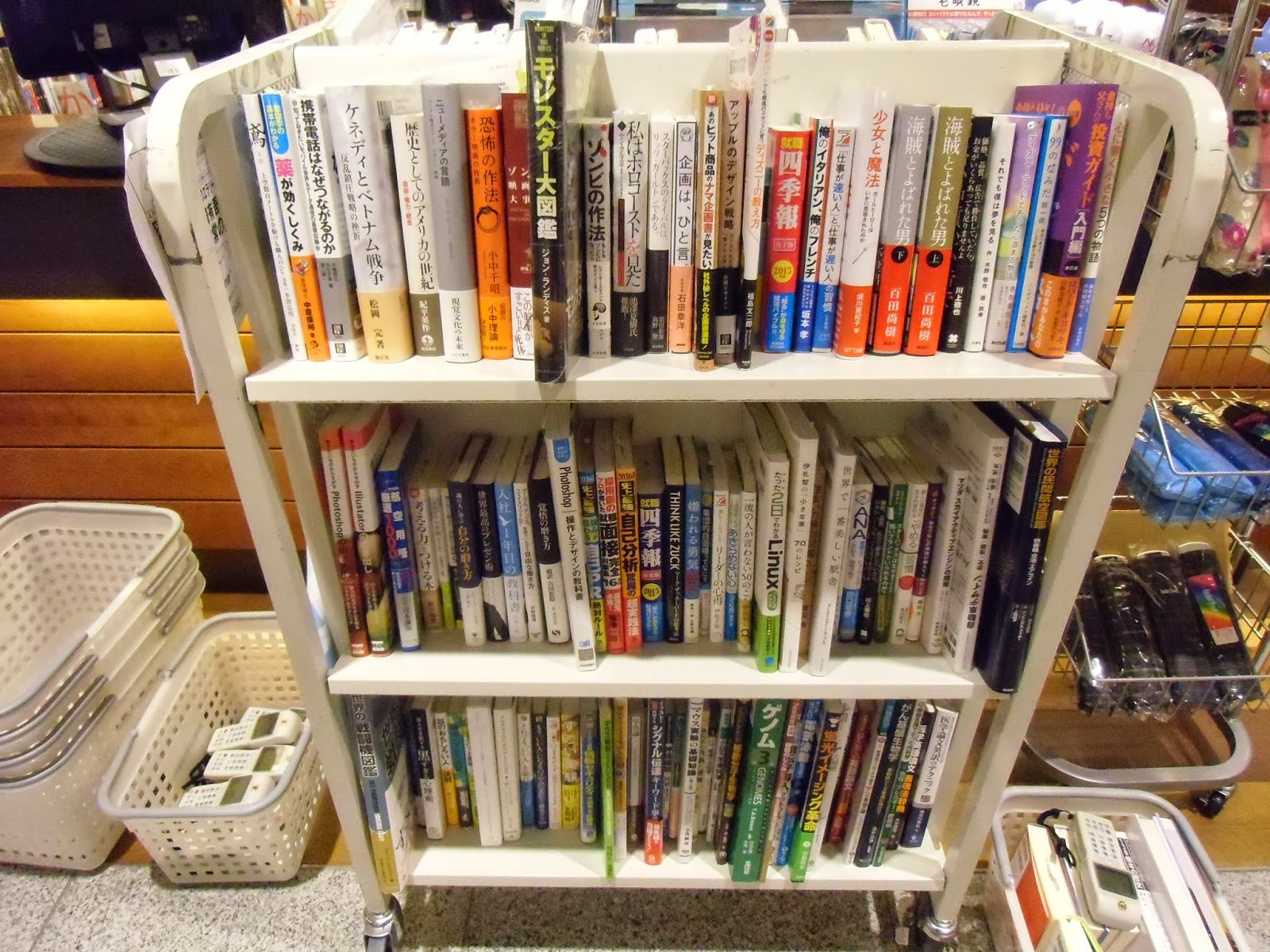 最初は、あまりの本の多さに圧倒されたのか、知り合いどうし固まって選んでいた学生さんたち。しかし、時間の経過と共に自分の興味のある分野へそれぞれ移動していきました。徐々にどれを選ぼうかと真剣になる様子がひしひしと伝わり、撮影担当職員は邪魔にならないように物陰からこっそりと写真をとることに。店内のいたるところにいる学生さんを探しては、不審者に間違われないかと若干不安になりつつ撮影に勤しみました。