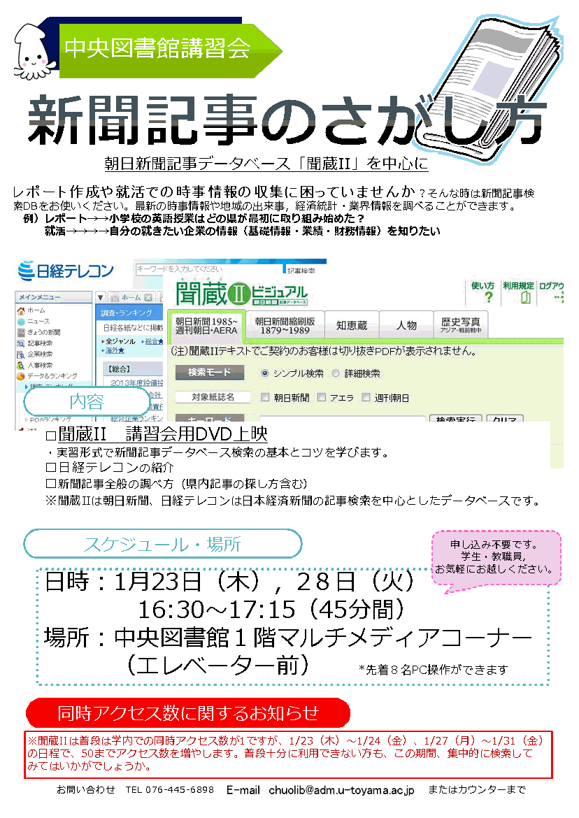 ※聞蔵IIは普段は学内での同時アクセス数が1ですが、1/23(木)~1/24(金)、1/27(月)~1/31(金)の日程で、50までアクセス数を増やします。普段十分に利用できない方も、この期間、集中的に検索してみてはいかがでしょうか。