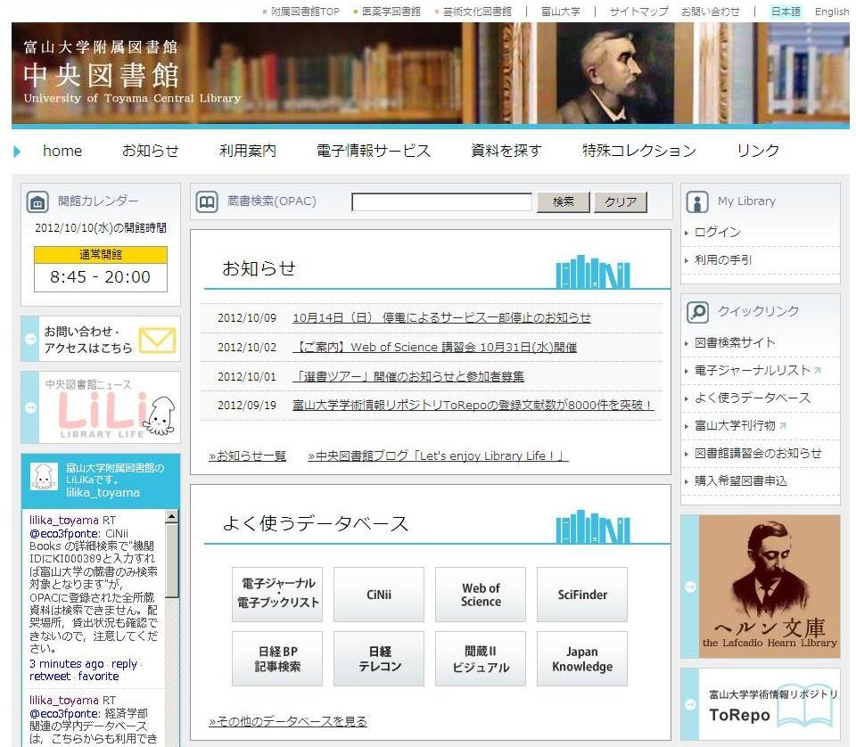 中央図書館のホームページをリニューアル! 中央図書館 10月10日(水)より、富山大学附属図書館中央図書館のホームページをリニューアルしました。 デザインと構成を一新し、使いやすくなった新しいホームページをご利用ください。 http://www.lib.u-toyama.ac.jp/chuo/index.html