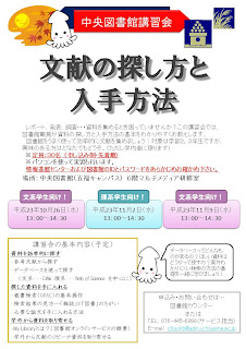 毎回好評の中央図書館での講習会「文献の探し方を入手方法」をこの秋にも開催します。
