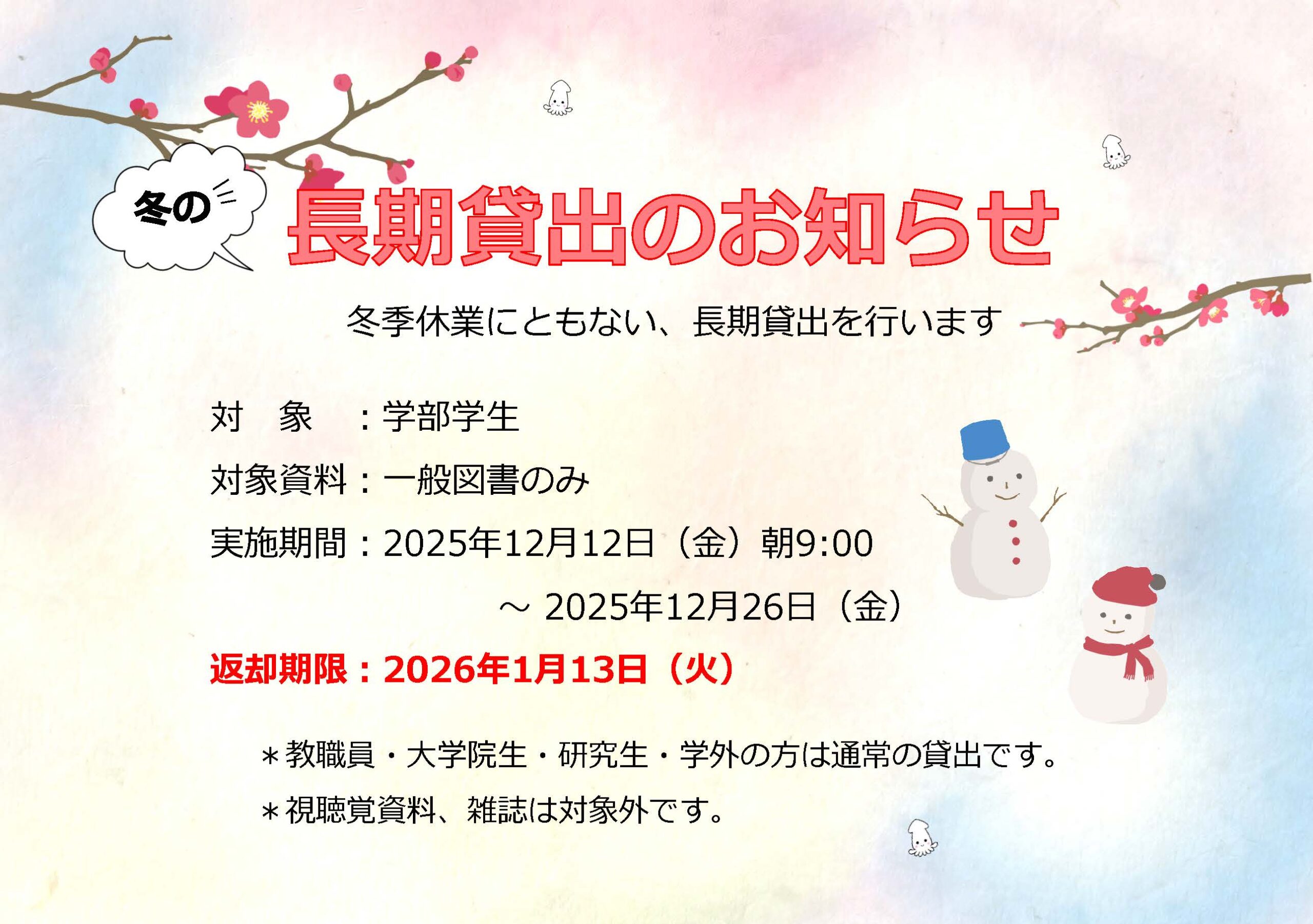 [学部学生の皆さまへ]冬の長期貸出を実施します(12/12-12/26) 医薬学図書館 2025年12月4日 冬季休業にともない、長期貸出を行います。 ◆対象:学部学生 ◆対象資料:一般図書のみ ◆実施期間:2025年12月12日(金)朝9:00 ~ 12月26日(金) ◆返却期限:2026年1月13日(火) [注意事項] *教職員・大学院生・研究生・学外の方は通常の貸出です。 *視聴覚資料、雑誌は対象外です。 *長期貸出実施期間より前に貸出した図書は、返却期限内に更新処理をしてください。