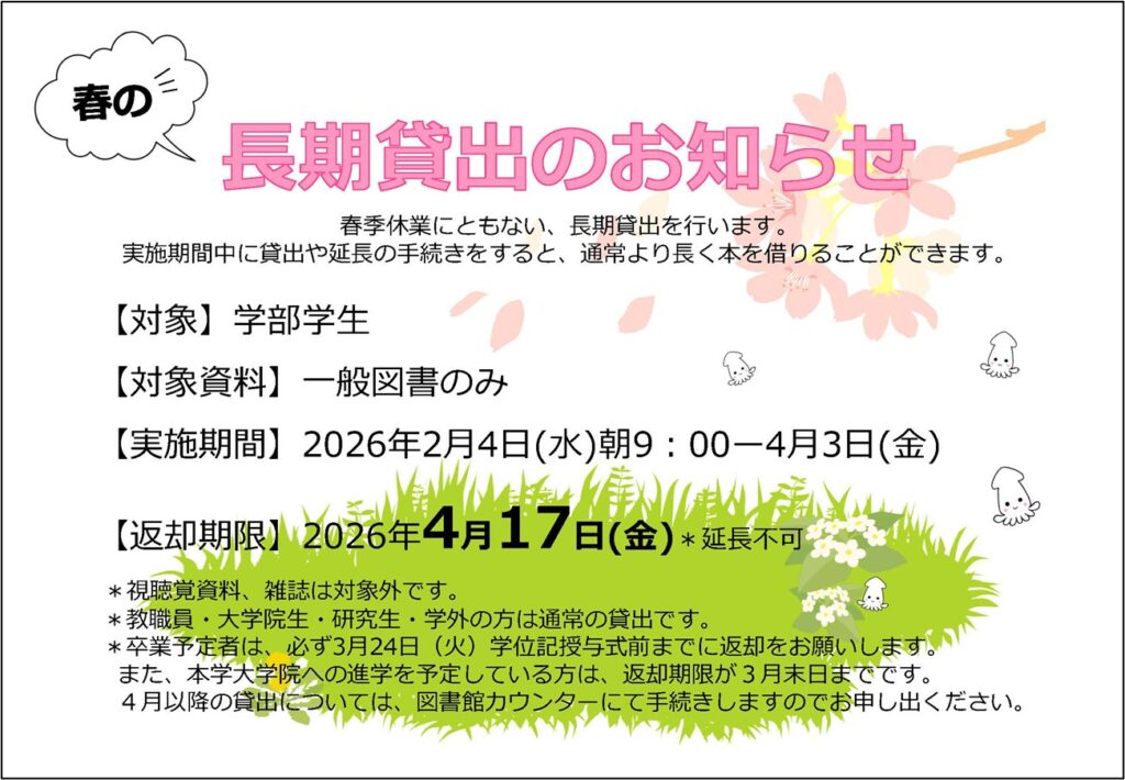 また、本学大学院への進学を予定している方は、返却期限が3月末日までです。